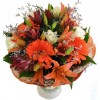 An orange & red vibrant strong colour mix with Lilies, Gerberas and Leucanthemums